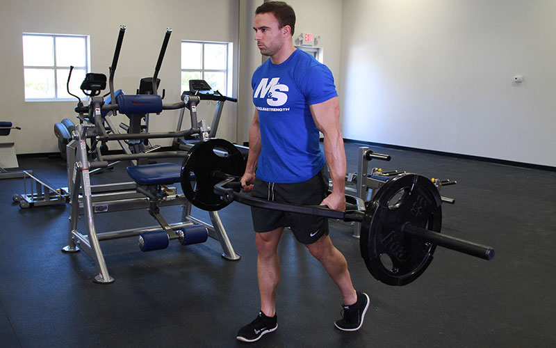 How to Perform: To perform a trap bar deadlift, start by positioning the bar in the middle of your feet. Your feet should be shoulder-width apart, and your grip should be just outside of shoulder-width. Bend at the hips and knees to lower your body down to the bar, keeping your back straight and your head up. Exhale as you drive through your heels to stand up tall, and squeeze your glutes at the top of the movement. Inhale as you lower the bar back down to the starting position. Repeat for 8-10 reps.
