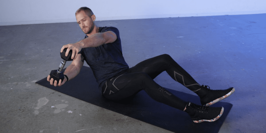 To perform the exercise, begin by sitting on the ground with your knees bent and your feet flat on the floor. Lean back a few inches while keeping your back straight. Next, twist your torso to the right, then to the left, and continue alternating sides. As you twist, reach your arms out in front of you and touch the ground on either side of your body. If you find it too easy at first, try using a weight in your hands as you rotate from side to side.