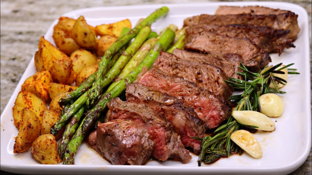 - Steak with onions, rice, and steamed broccoli