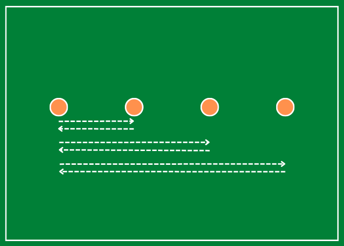 Starting at the first cone, take small controlled touches towards the second cone. When you reach the cone, turn and dribble back. Then, dribble towards the second cone with slightly more pace. After you return, dribble at full speed towards the third cone, before sharply cutting back and returning to the starting cone.